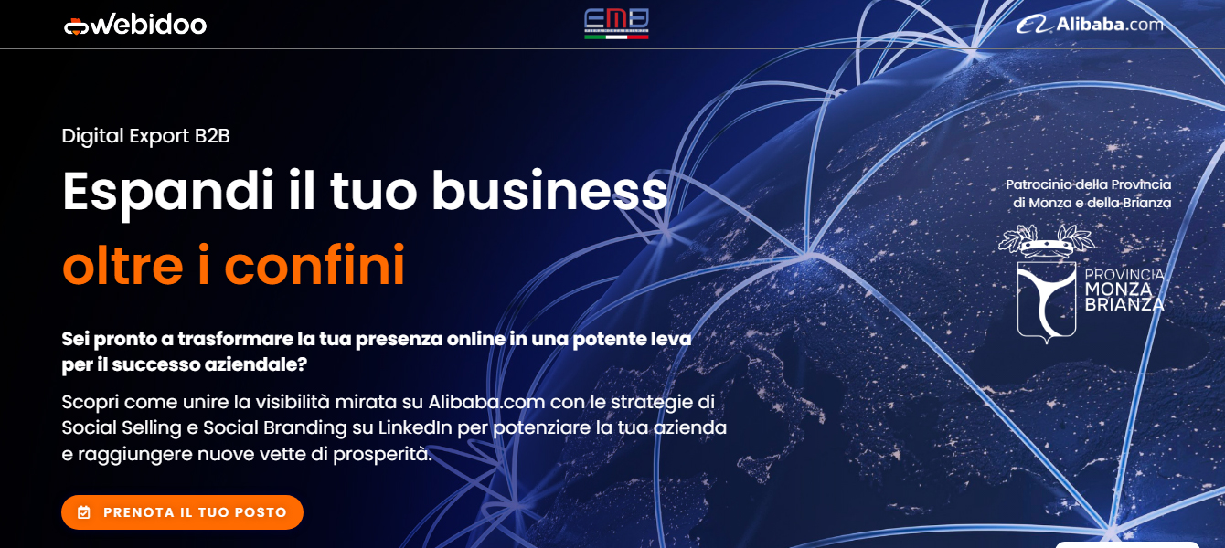 Durante l'evento condivideremo strategie di marketing e di branding efficaci per raggiungere il tuo target all’estero, impareremo come utilizzare Alibaba.com per esportare i tuoi prodotti e scopriremo come Webidoo può supportarti nella realizzazione dei tuoi obiettivi di business internazionale.