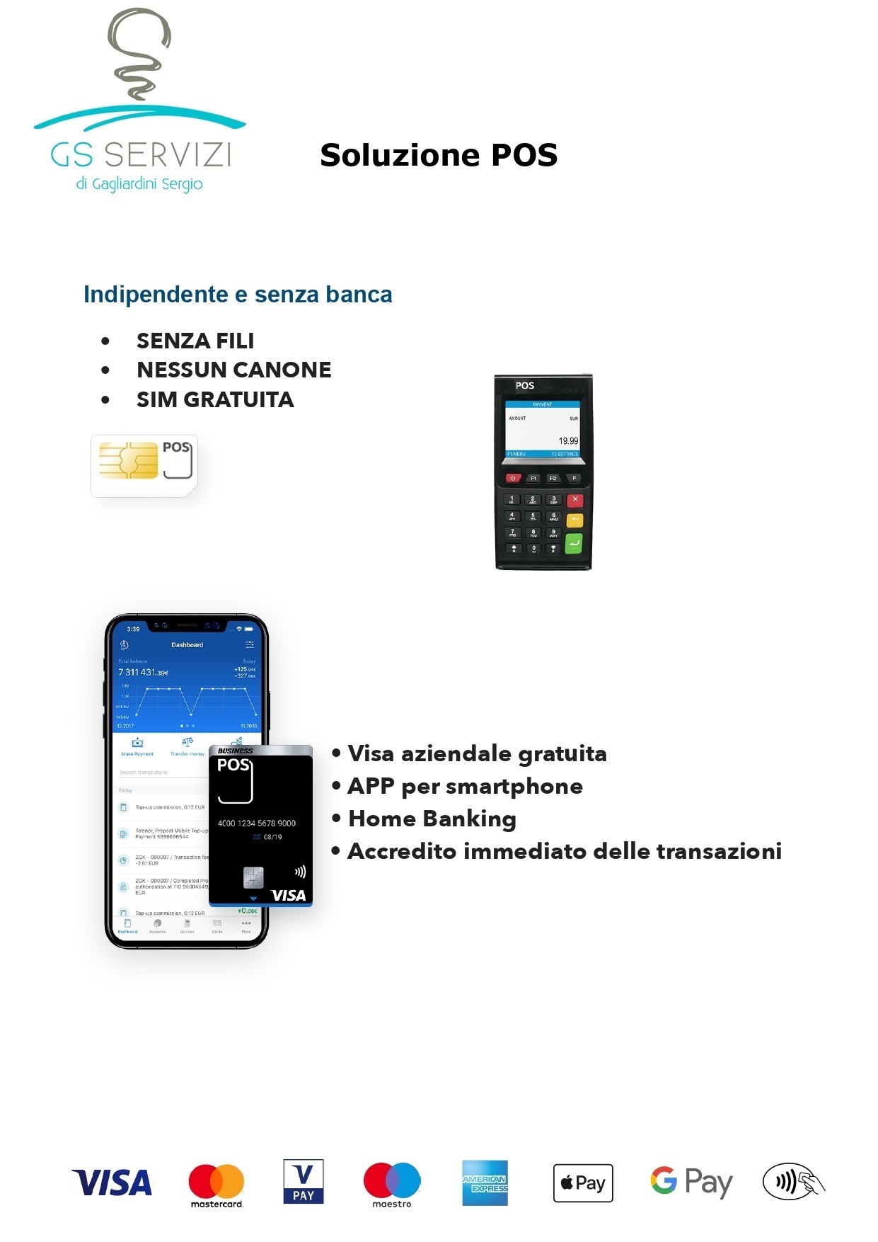 Cosa aspetti, acquista il Pos; mi metterò in contatto subito dopo con te per seguirti nell'apertura del conto online, ricevere la carta Visa, e iniziare a usare il Pos nel miglior modo possibile; rilascia i tuoi dati fiscali per l'emissione della fattura. Garanzia 1 anno, nessun contratto vincolante.