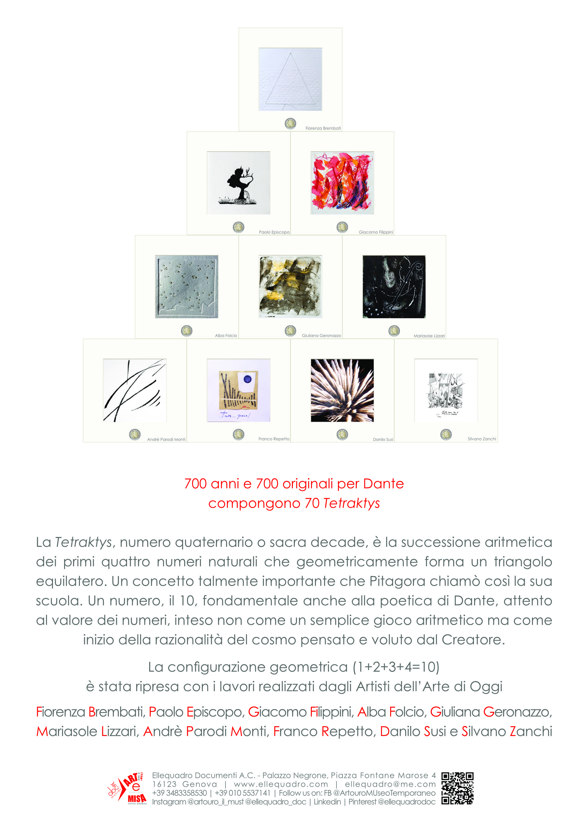 700 opere uniche per i 700 anni di Dante e 70 studi preparatori costituiscono le Tetraktys. Il concetto risale a Pitagora e vede il 10 come numero divino quale somma di 1+2+3+4. Il lessico di 10 artisti appassionati del Sommo Poeta si modula così sul tema di Dante tra focus, incontri, luoghi ricchi di fascino, cenacoli, selfie e un momento ludico-creativo che coinvolge l'osservatore.